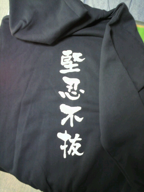 堅忍不抜Tシャツに次ぐ(^-^)b第二弾として、パーカーを作りました(-ω☆裏起毛で(^o^ゞ価格は3400円!着心地暖かく最高O(≧∇≦)O !!です。サイズは、S~XLまで是非皆さんにお勧めしたい一枚です。お待ちしております(*^-')b